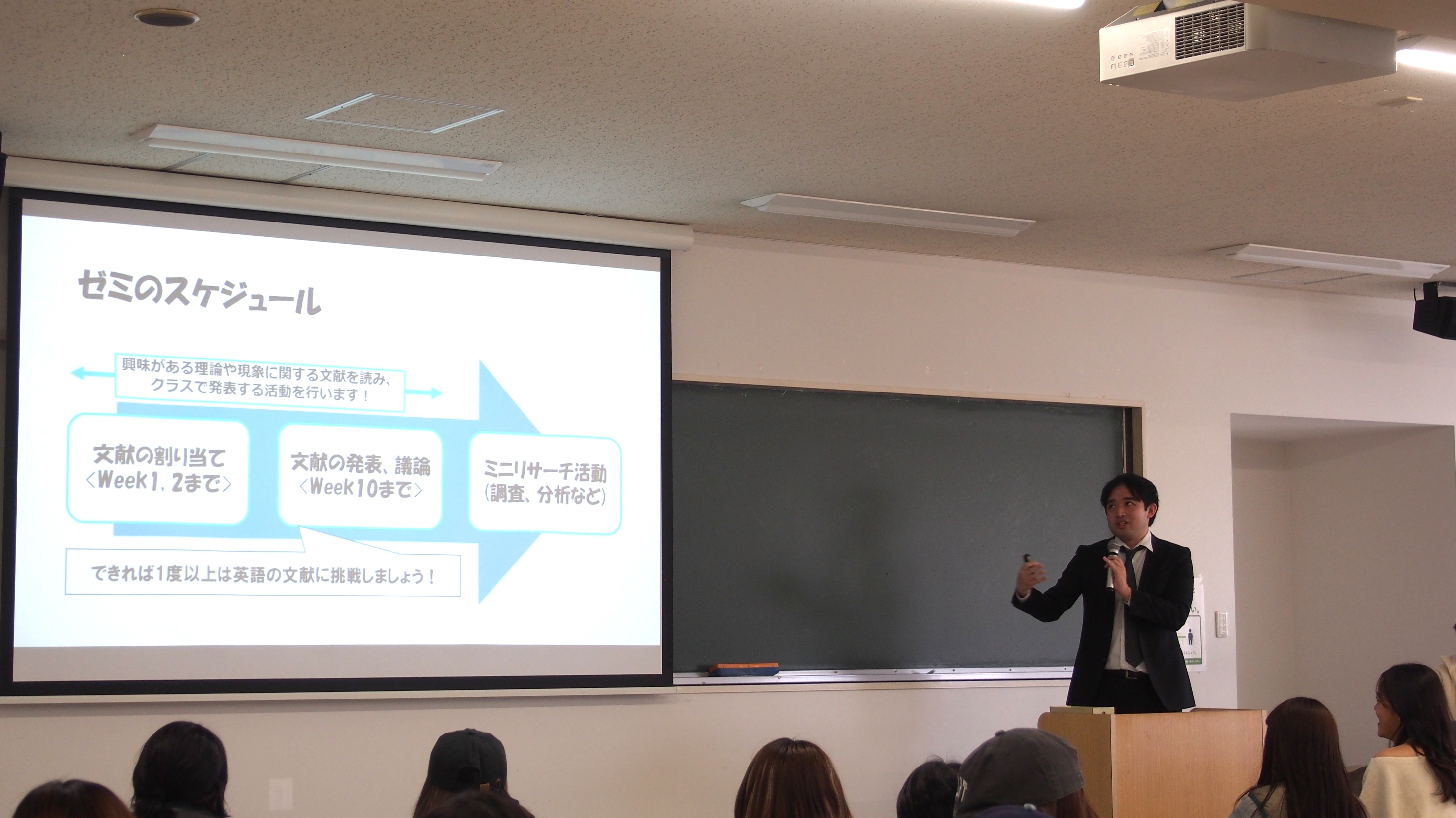 一方、英語コミュニケーション専攻では、各担当教員によるゼミ内容のプレゼンテーションが行われ、各ゼミの特徴や取り組みが紹介されました。